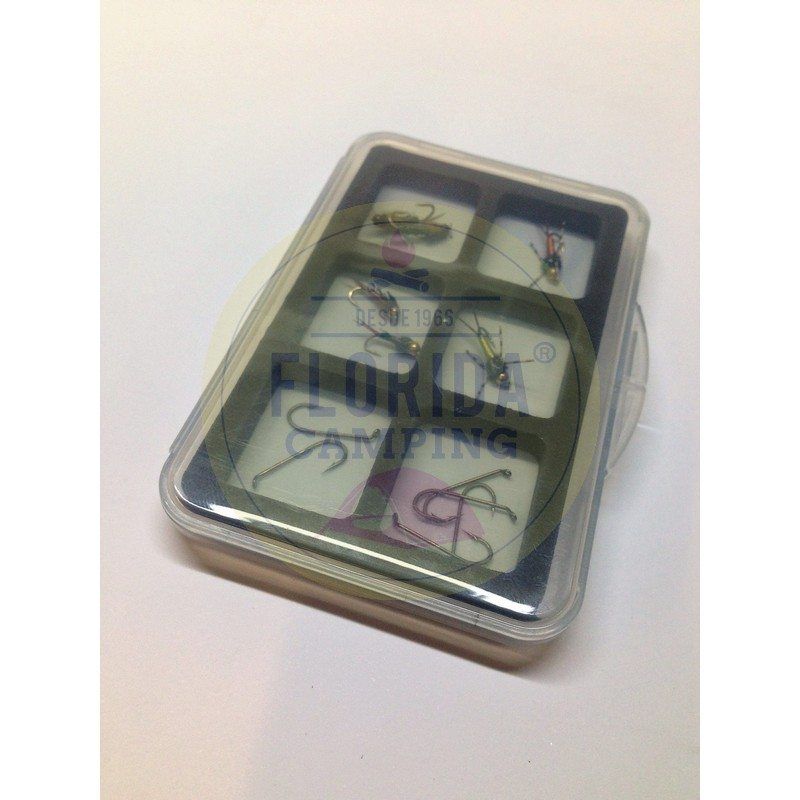 Caja para moscas o anzuelos ultradelgada con 6 compartimientos.