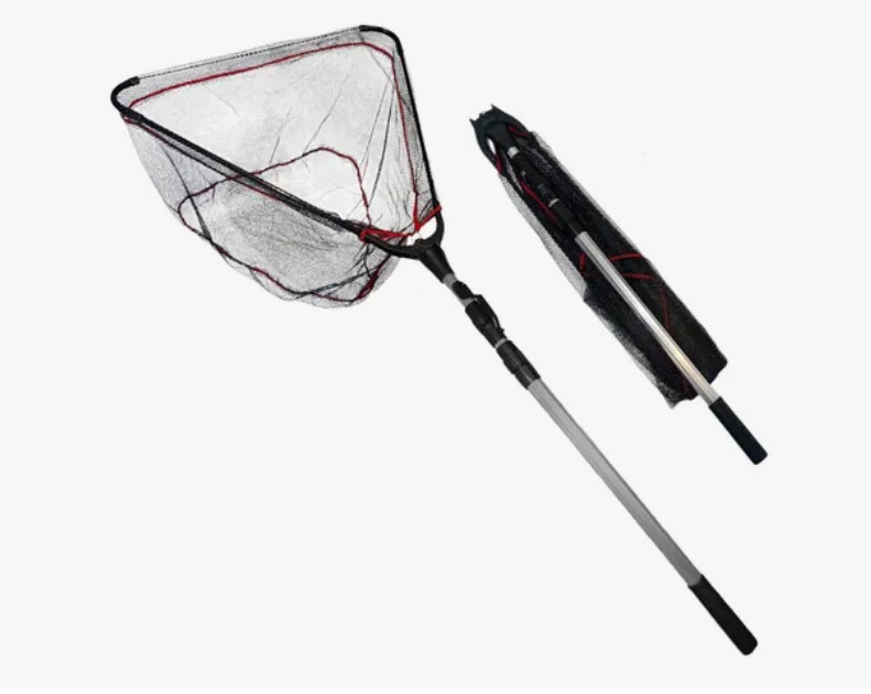 Su red triangular está diseñada para atrapar peces de manera eficiente.