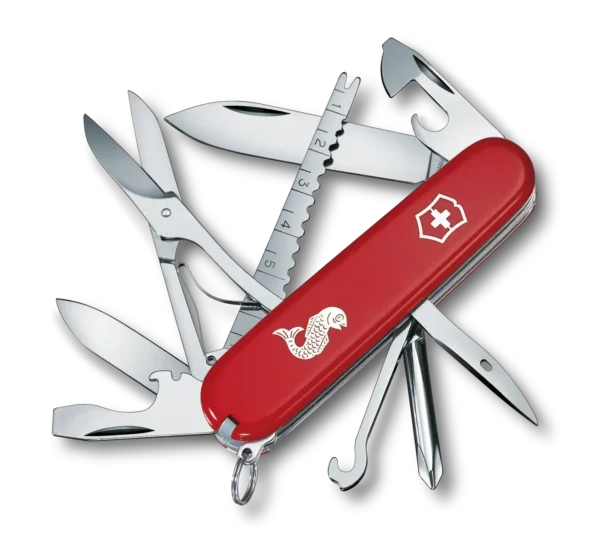Cuando escuches hablar de la Navaja Suiza, es probable que venga a tu mente el recuerdo de la legendaria navaja para oficiales. Esa leyenda sigue viva con la navaja de bolsillo Fisherman. Se diseñó y fabricó teniendo en cuenta las necesidades de los pescadores y, por supuesto, incluye un descamador de pescados y un saca anzuelos. Guárdala en tu caja de aparejos y siempre estarás listo para tu próxima gran pesca.