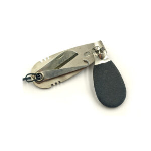 Cortalineas metálico multifunción, ideal para cortar nylon, multifilamento o afilar anzuelos, con superficie antideslizante para un uso cómodo y seguro. Viene acompañado por una cinta métrica perfecta para medir rápidamente las capturas sin necesidad de accesorios adicionales.